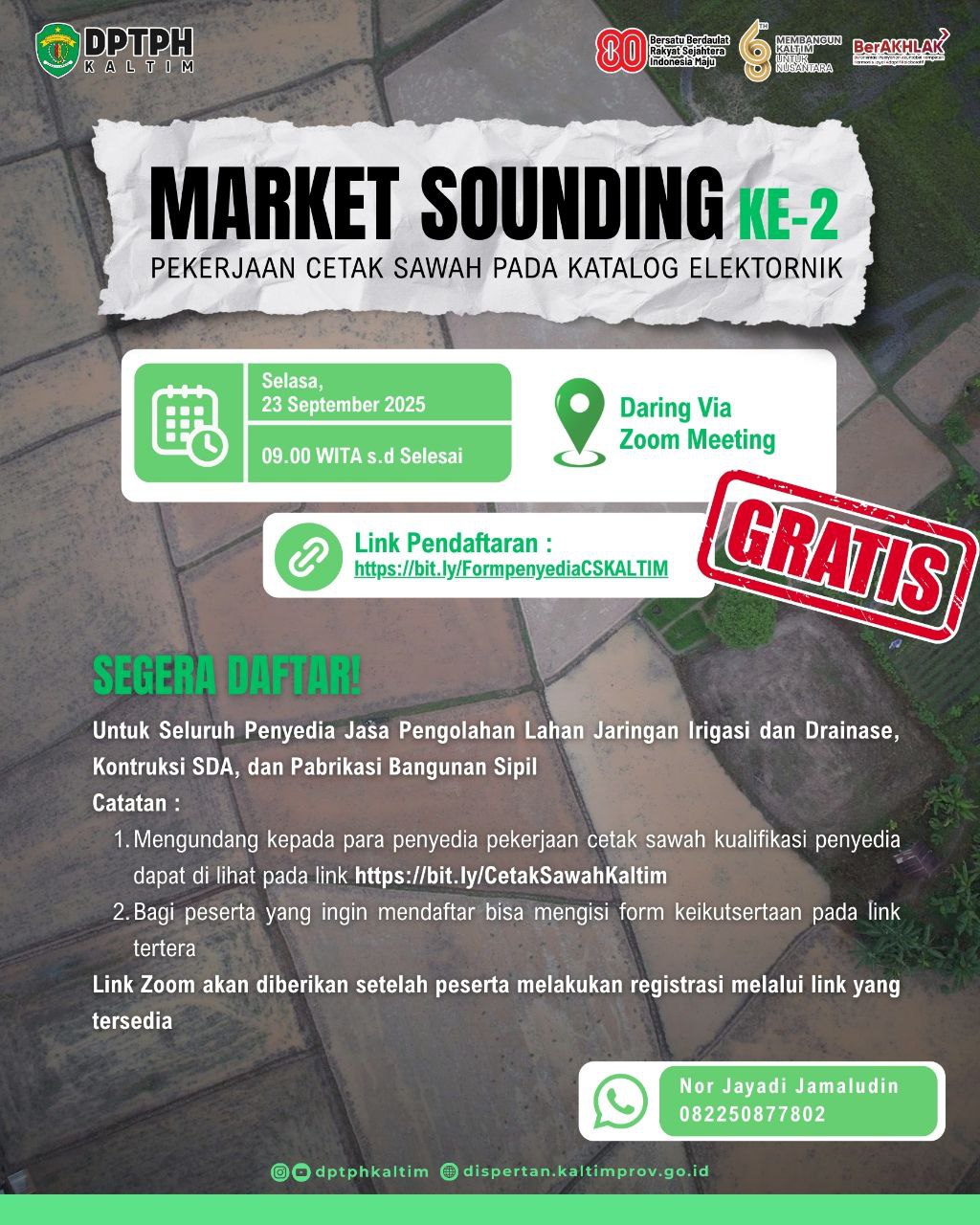 Dinas Pangan, Tanaman Pangan dan Hortikultura (DPTPH) Provinsi Kalimantan Timur mengundang seluruh Penyedia Jasa Pengolahan Lahan, Jaringan Irigasi dan Drainase, Konstruksi SDA, dan Pabrikasi Bangunan Sipil untuk berpartisipasi dalam Market Sounding Ke-2 Pekerjaan Cetak Sawah pada Katalog Elektronik.