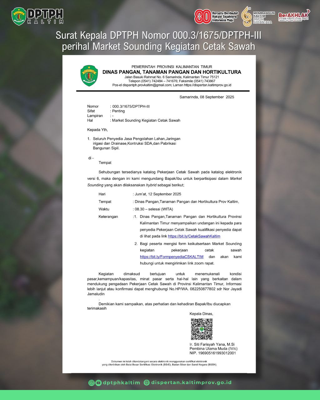 Dinas Pangan, Tanaman Pangan dan Hortikultura (DPTPH) Provinsi Kalimantan Timur mengundang seluruh Penyedia Jasa Pengolahan Lahan, Jaringan Irigasi dan Drainase, Konstruksi SDA, dan Pabrikasi Bangunan Sipil untuk berpartisipasi dalam Market Sounding Kegiatan Cetak Sawah yang akan dilaksanakan secara daring.